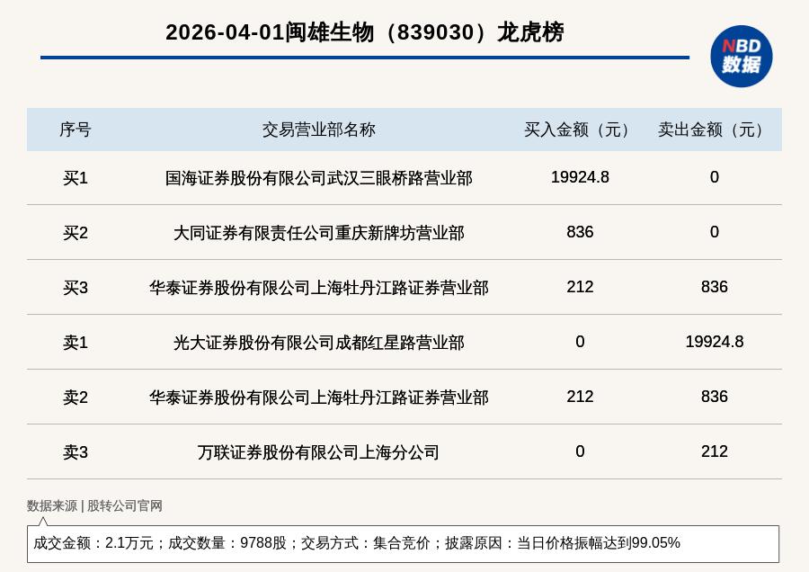 每经讯,2026年4月1日,新三板创新层公司闽雄生物(839030,收盘价:2.1元)登上龙虎榜,交易方式是集合竞价,披露原因是当日价格振幅达到99.05%,成交数量9788股,成交金额2.1万元。买一席位为国海证券股份有限公司武汉三眼桥路营业部,买入1.99万元;卖一席位为光大证券股份有限公司成都红星路营业部,卖出1.99万元。