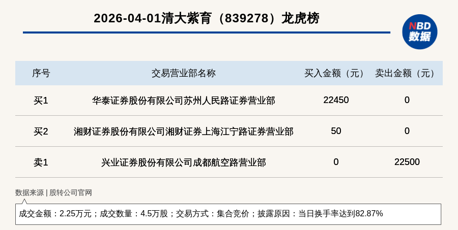 每经讯,2026年4月1日,新三板基础层公司清大紫育(839278,收盘价:0.5元)登上龙虎榜,交易方式是集合竞价,披露原因是当日换手率达到82.87%,成交数量4.5万股,成交金额2.25万元。买一席位为华泰证券股份有限公司苏州人民路证券营业部,买入2.24万元;卖一席位为兴业证券股份有限公司成都航空路营业部,卖出2.25万元。