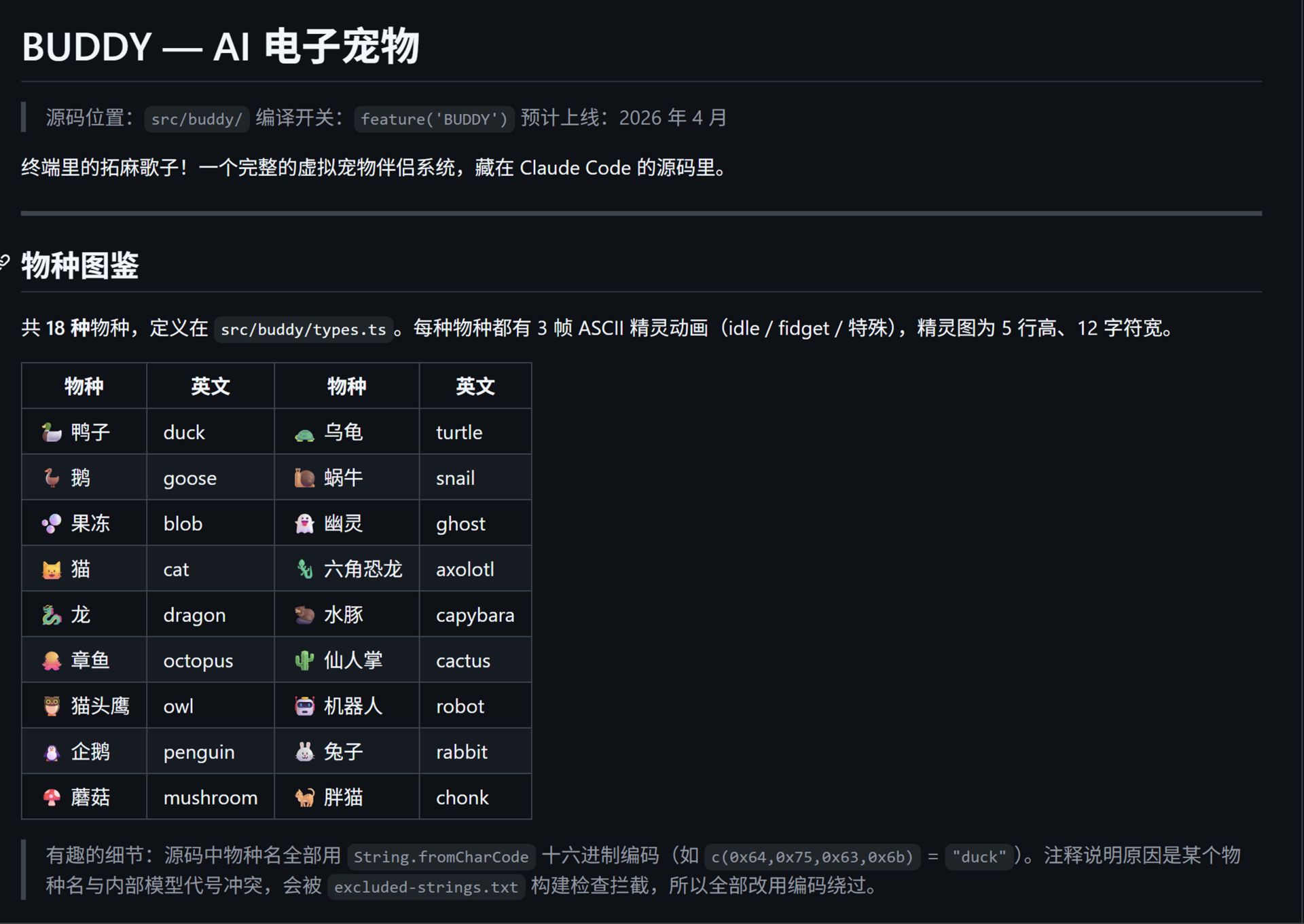 代码显示,BUDDY是一个类似上世纪90年代风靡全球的电子宠物“拓麻歌子”(Tamagotchi)的AI伴侣系统。其核心机制结合用户ID与伪随机算法生成唯一角色,包括物种、稀有度、外观与属性等。系统还支持“抽卡”、闪光变种等设定,并由模型自动生成“灵魂描述”。值得一提的是,宠物的关键属性并非存储,而是基于用户ID动态计算生成,使其具有稳定且不可篡改的唯一性。