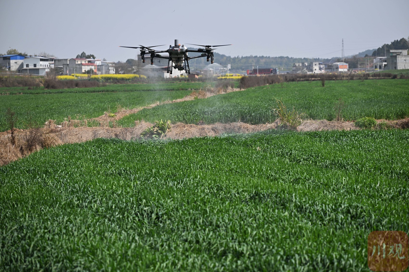 3月24日清晨,绵阳市游仙区仙鹤镇帽儿山上一望无际的麦田里,麦浪随风起伏。田埂边,植保无人机腾空而起,在麦浪上方来回穿梭,细密的药剂均匀洒下,为正值扬花期的小麦披上一层“防护衣”。