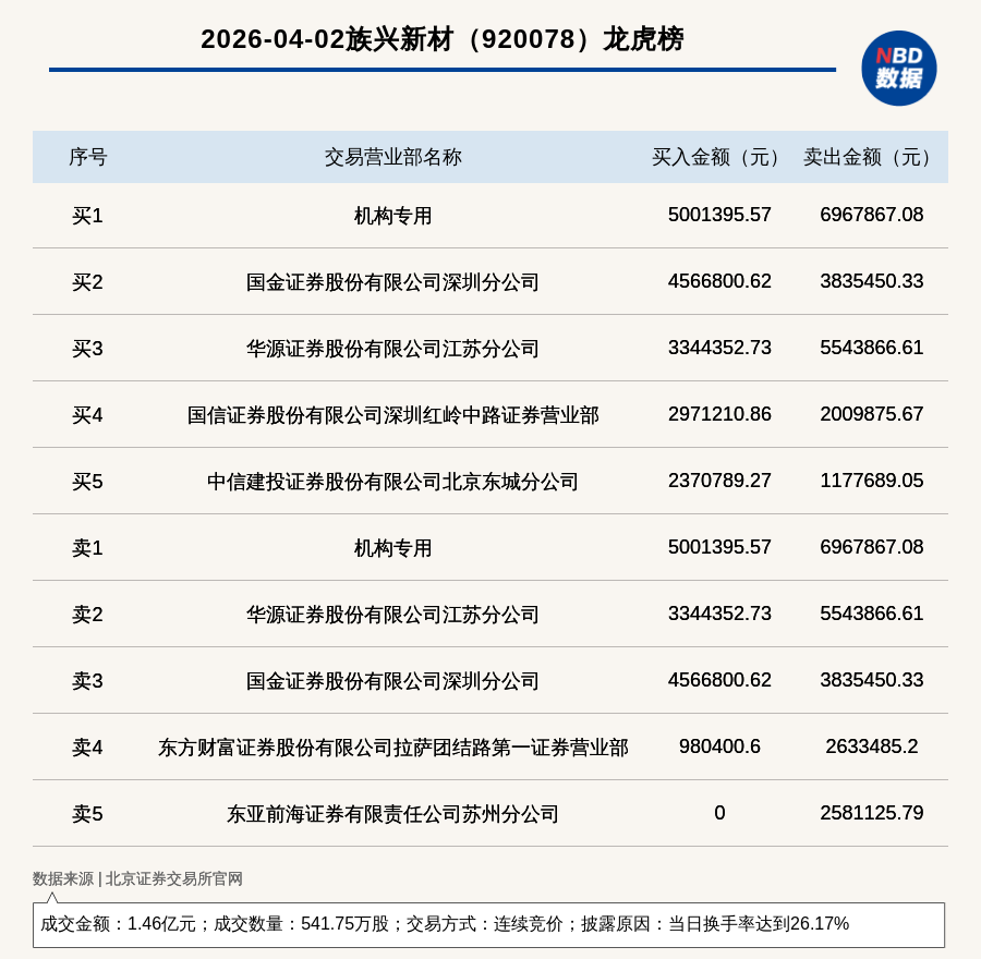 每经讯,2026年4月2日,北交所上市公司族兴新材(920078,收盘价:25.9元)登上龙虎榜,交易方式是连续竞价,披露原因是当日换手率达到26.17%,成交数量541.75万股,成交金额1.46亿元。买一席位为机构专用,买入500.14万元;卖一席位为机构专用,卖出696.79万元。
