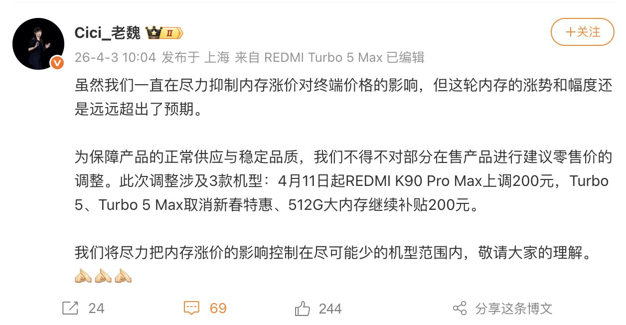 4月3日,小米中国区市场部总经理魏思琪称,内存涨价幅度超预期,为保障供应与品质,小米4月11日起对3款机型调价,REDMI K90 Pro Max上调200元,Turbo 5等取消特惠。此前财报会上卢伟冰也谈及存储涨价,称其影响不限于手机行业,低端手机受影响更大,小米尽量顶住压力,还认为涨价周期结束后产业格局将重塑。