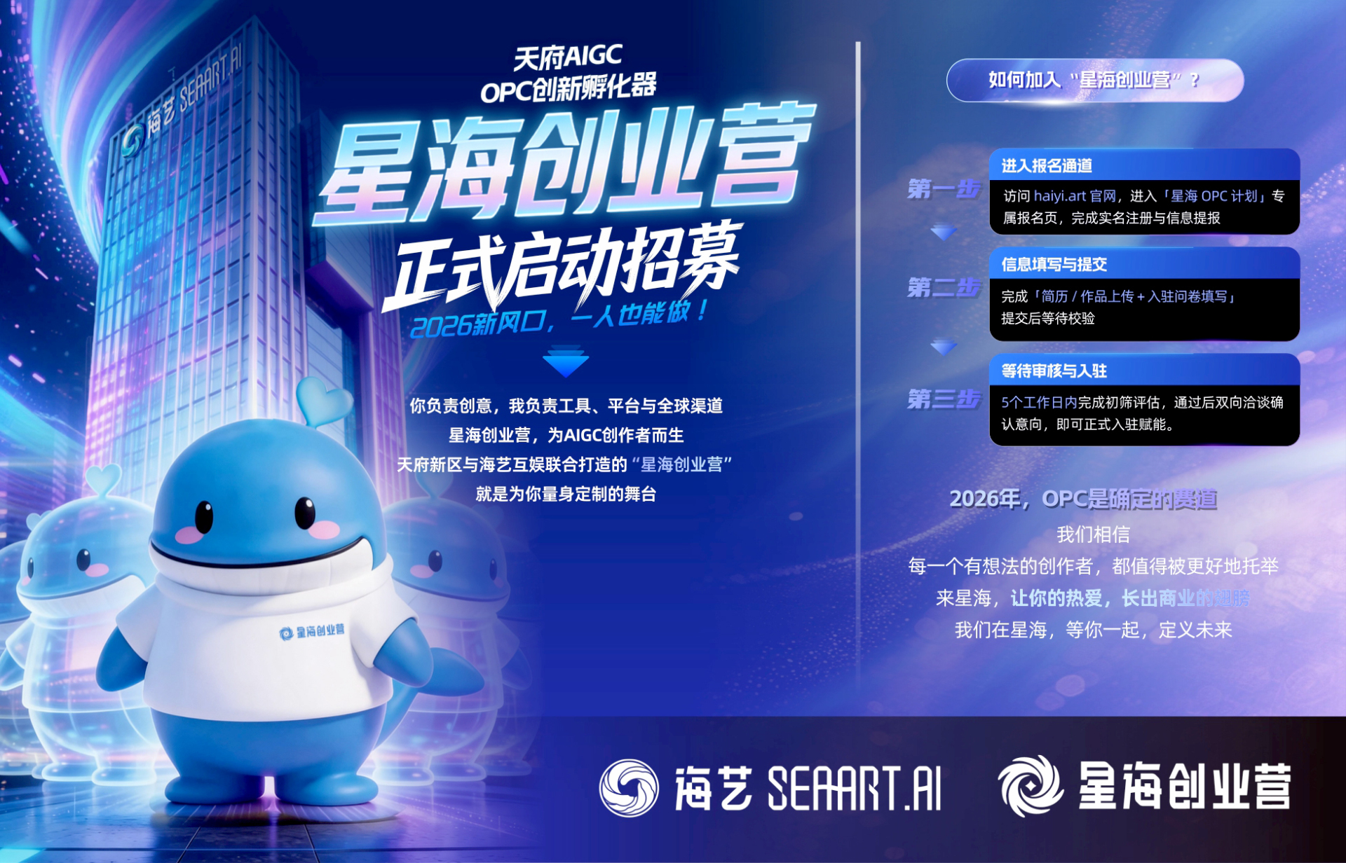 作为项目核心运营方,海艺互娱是天府新区本土深耕人工智能领域的骨干企业。此前,企业已明确将于4月在新区落地OPC孵化基地,依托自身技术、流量与渠道优势,为广大AIGC创业个体搭建全周期、全维度支撑体系,助力创作者成长为数字经济时代的“超级个体”。