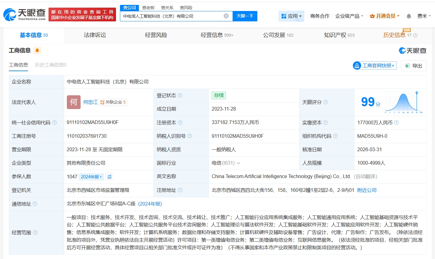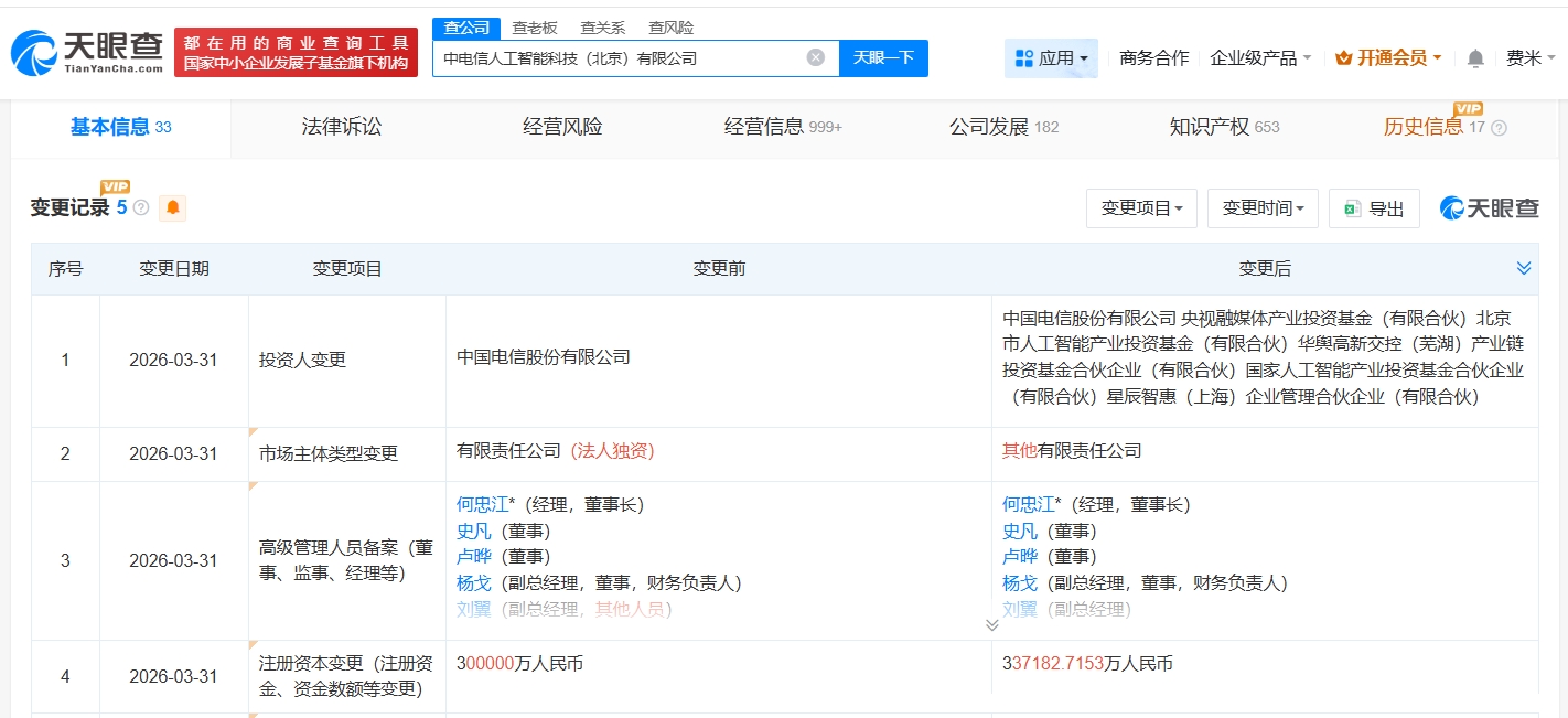 每经AI快讯,天眼查App显示,近日,中电信人工智能科技(北京)有限公司发生工商变更,新增北京市人工智能产业投资基金(有限合伙)、国家人工智能产业投资基金合伙企业(有限合伙)等为股东,同时,注册资本由30亿元人民币增至约33.7亿元人民币,增幅约12%。该公司成立于2023年11月,法定代表人为何忠江,经营范围含人工智能行业应用系统集成服务、人工智能基础资源与技术平台、人工智能理论与算法软件开发等,现由中国电信(601728)及上述新增股东共同持股。
