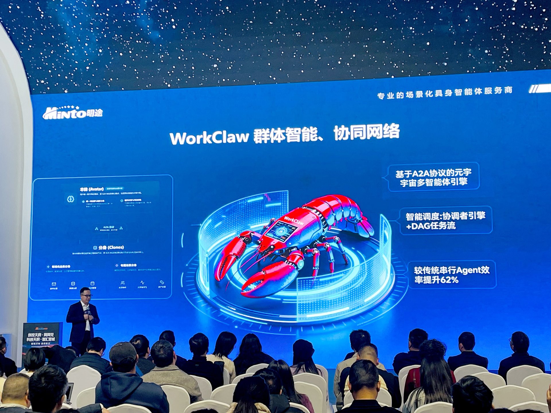 这款“成都造AI龙虾”有着硬核技术支撑。WorkClaw依托智能体评价算法,在保障数据安全的同时,可降低45%的算力消耗;搭配的WorkBot智盒一体机采用全栈自研集中式架构,支持离线运行,能精准满足政务、医疗等高敏行业的数据安全需求。搭载主动交互引擎后,智能体可实现“蜂群式”协同,自动拆解复杂任务、分工执行,形成群体智能合力。发布会同时联动马来西亚、新加坡等海外分会场,引发跨国技术共振。