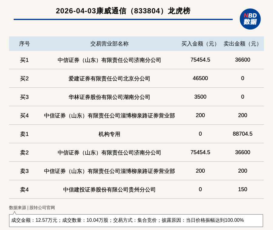 每经讯,2026年4月3日,新三板基础层公司康威通信(833804,收盘价:2元)登上龙虎榜,交易方式是集合竞价,披露原因是当日价格振幅达到100.00%,成交数量10.04万股,成交金额12.57万元。买一席位为中信证券(山东)有限责任公司济南分公司,买入7.55万元;卖一席位为机构专用,卖出8.87万元。