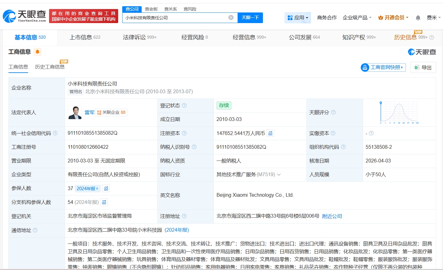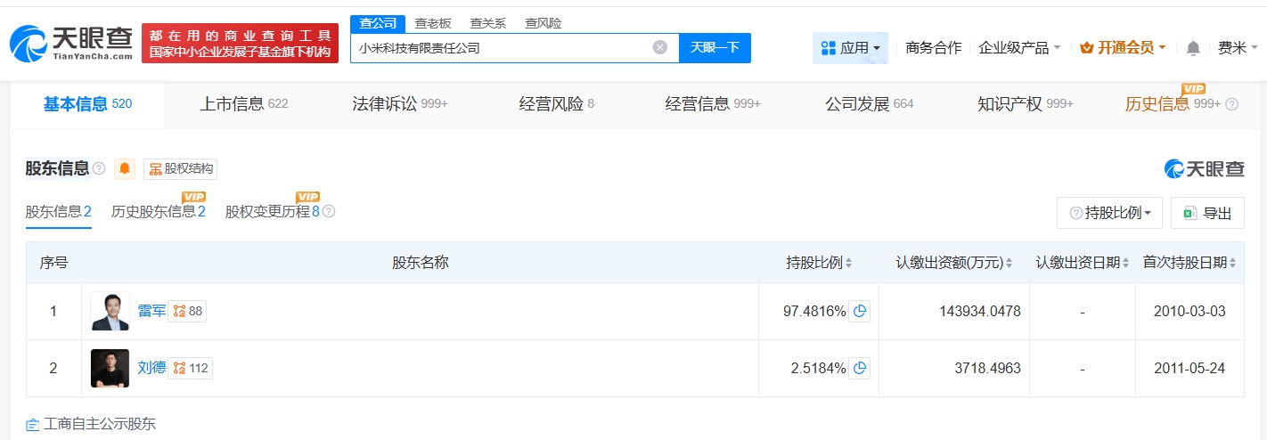 每经AI快讯,天眼查App显示,近日,小米科技有限责任公司发生工商变更,原股东小米联合创始人黎万强、洪锋退出,同时,注册资本由18.5亿元人民币减至约14.8亿元人民币。该公司成立于2010年3月,法定代表人为雷军,经营范围包括通讯设备销售、厨具卫具及日用杂品批发、厨具卫具及日用杂品零售等,现由雷军、刘德共同持股。