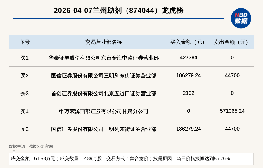 每经讯,2026年4月7日,新三板创新层公司兰州助剂(874044,收盘价:19.01元)登上龙虎榜,交易方式是集合竞价,披露原因是当日价格振幅达到56.76%,成交数量2.89万股,成交金额61.58万元。买一席位为华泰证券股份有限公司东台金海中路证券营业部,买入42.74万元;卖一席位为申万宏源西部证券有限公司甘肃分公司,卖出57.11万元。