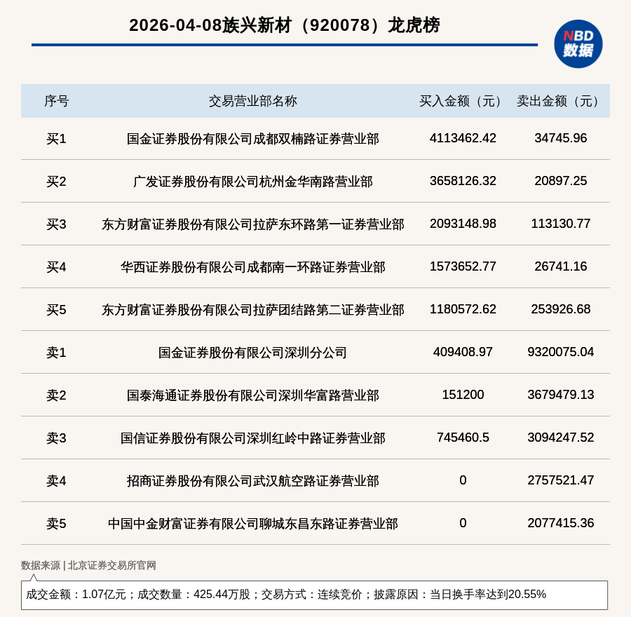 每经讯,2026年4月8日,北交所上市公司族兴新材(920078,收盘价:25.33元)登上龙虎榜,交易方式是连续竞价,披露原因是当日换手率达到20.55%,成交数量425.44万股,成交金额1.07亿元。买一席位为国金证券股份有限公司成都双楠路证券营业部,买入411.35万元;卖一席位为国金证券股份有限公司深圳分公司,卖出932.01万元。