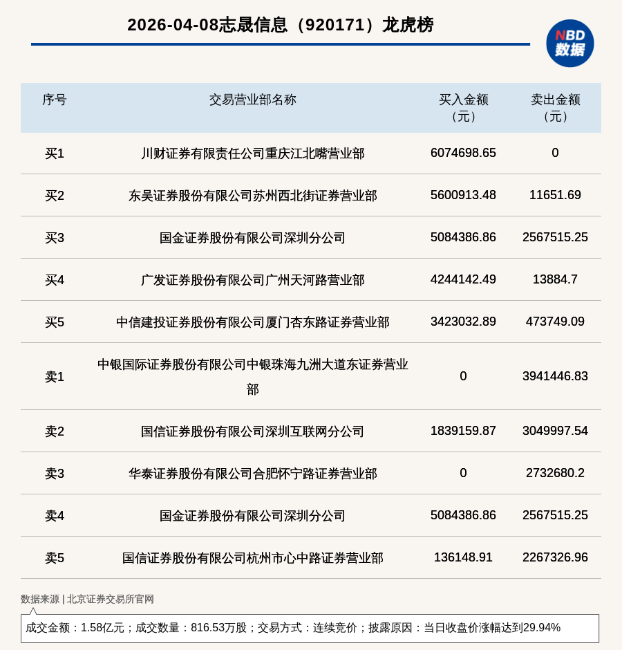 每经讯,2026年4月8日,北交所上市公司志晟信息(920171,收盘价:21.09元)登上龙虎榜,交易方式是连续竞价,披露原因是当日收盘价涨幅达到29.94%,成交数量816.53万股,成交金额1.58亿元。买一席位为川财证券有限责任公司重庆江北嘴营业部,买入607.47万元;卖一席位为中银国际证券股份有限公司中银珠海九洲大道东证券营业部,卖出394.14万元。