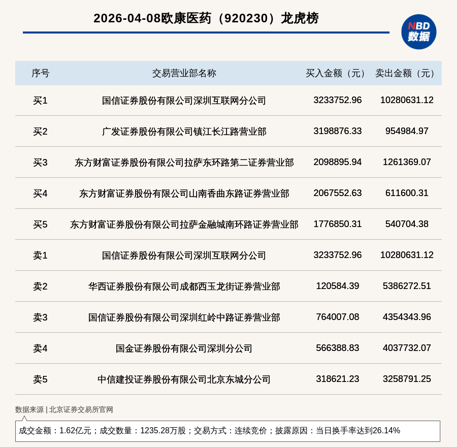 每经讯,2026年4月8日,北交所上市公司欧康医药(920230,收盘价:12.98元)登上龙虎榜,交易方式是连续竞价,披露原因是当日换手率达到26.14%,成交数量1235.28万股,成交金额1.62亿元。买一席位为国信证券股份有限公司深圳互联网分公司,买入323.38万元;卖一席位为国信证券股份有限公司深圳互联网分公司,卖出1028.06万元。