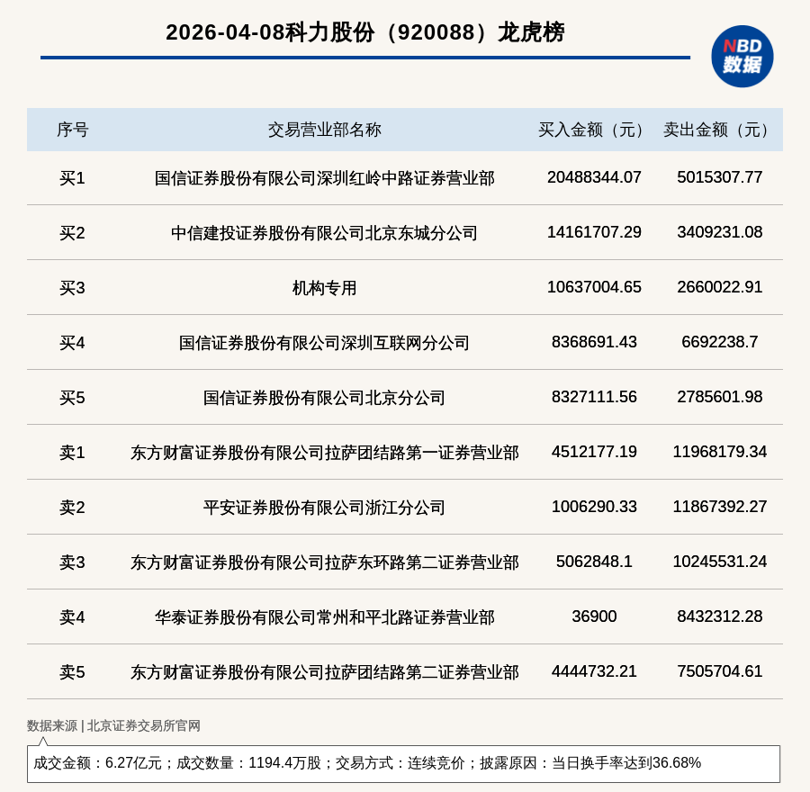 每经讯,2026年4月8日,北交所上市公司科力股份(920088,收盘价:52.82元)登上龙虎榜,交易方式是连续竞价,披露原因是当日换手率达到36.68%,成交数量1194.4万股,成交金额6.27亿元。买一席位为国信证券股份有限公司深圳红岭中路证券营业部,买入2048.83万元;卖一席位为东方财富证券股份有限公司拉萨团结路第一证券营业部,卖出1196.82万元。
