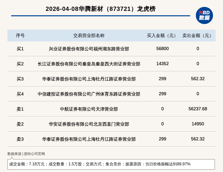 每经讯,2026年4月8日,新三板创新层公司华腾新材(873721,收盘价:2.99元)登上龙虎榜,交易方式是集合竞价,披露原因是当日价格振幅达到89.97%,成交数量1.5万股,成交金额7.18万元。买一席位为兴业证券股份有限公司福州湖东路营业部,买入5.68万元;卖一席位为中航证券有限公司天津营业部,卖出5.62万元。