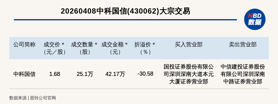 每经讯,2026年4月8日,新三板创新层公司中科国信(430062,收盘价:2.42元)发生一笔大宗交易,成交价1.68元/股,成交数量25.1万股,成交金额42.17万元,折价30.58%。买入营业部是国投证券股份有限公司深圳深南大道本元大厦证券营业部,卖出营业部是中信建投证券股份有限公司深圳深南中路证券营业部。