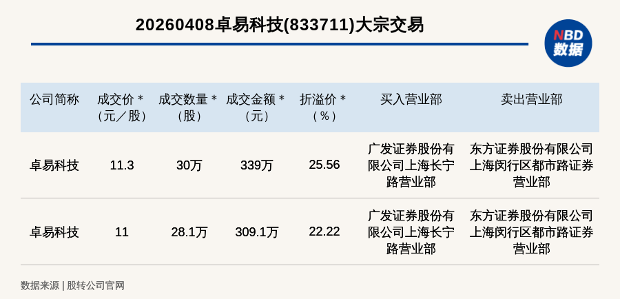 每经讯,2026年4月8日,新三板基础层公司卓易科技(833711,收盘价:9元)发生2笔大宗交易,溢价率最高的一笔成交价11.3元/股,成交数量30万股,成交金额339万元,溢价25.56%。买入营业部是广发证券股份有限公司上海长宁路营业部,卖出营业部是东方证券股份有限公司上海闵行区都市路证券营业部。
