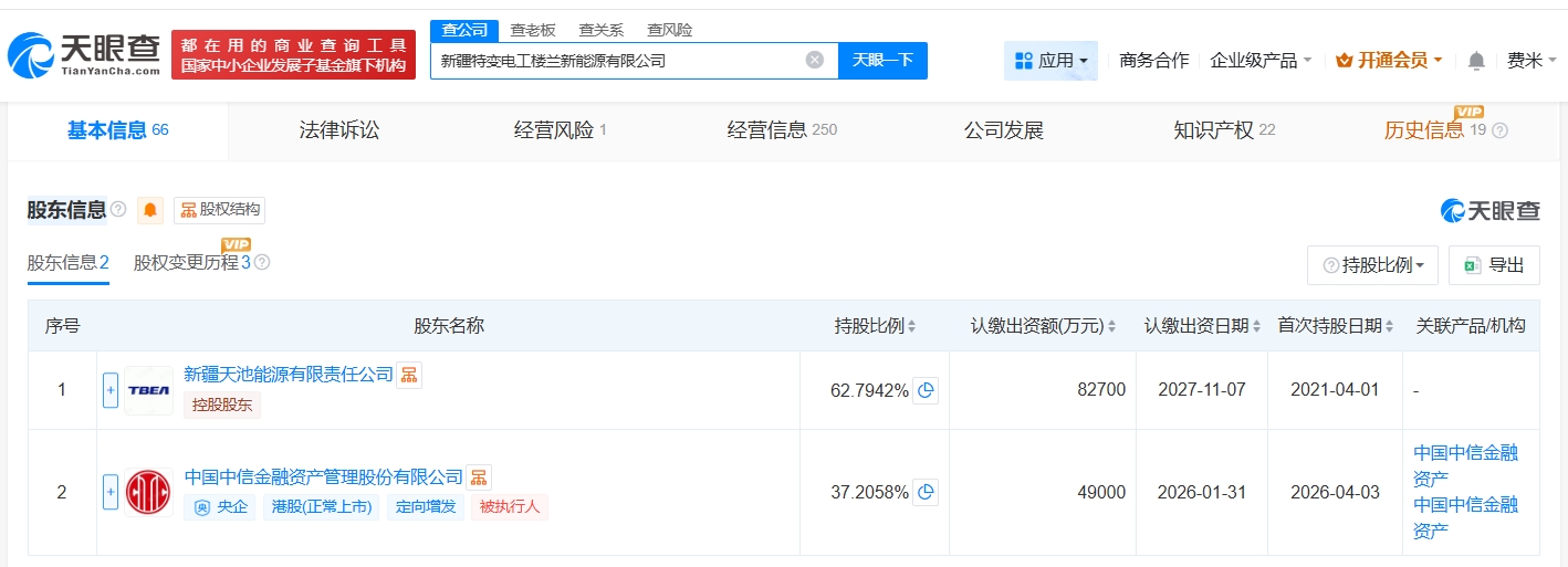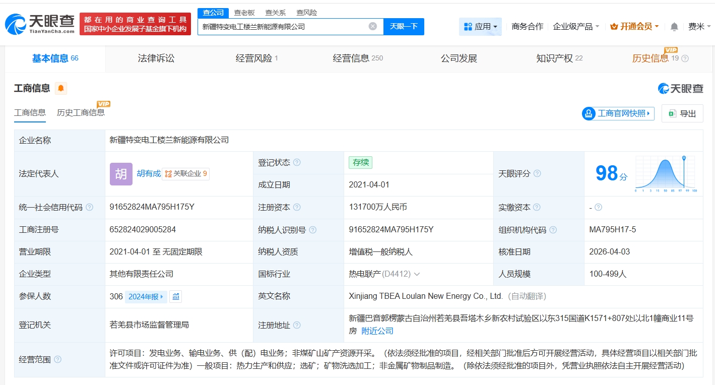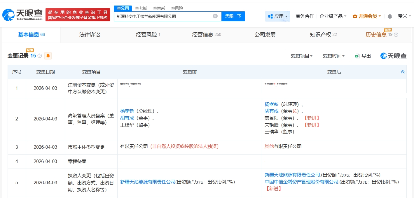每经AI快讯,天眼查App显示,近日,新疆特变电工楼兰新能源有限公司发生工商变更,新增中信金融资产(02799.HK)为股东,同时,注册资本由8.27亿元人民币增至13.17亿元人民币,增幅约59%。该公司成立于2021年4月,法定代表人为胡有成,经营范围包括发电业务、输电业务、供(配)电业务、热力生产和供应等,现由特变电工旗下新疆天池能源有限责任公司及上述新增股东共同持股。