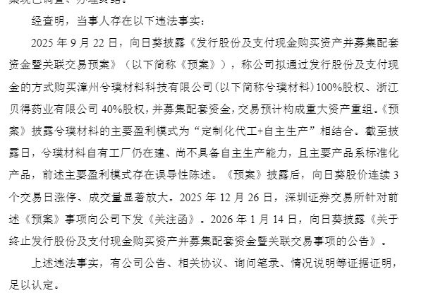 经查明,引发此次处罚的违法事实发生在2025年9月22日。当日,向日葵披露了一份《发行股份及支付现金购买资产并募集配套资金暨关联交易预案》(以下简称预案),称公司计划通过发行股份及支付现金的方式,收购漳州兮璞材料科技有限公司(以下简称兮璞材料)100%股权和浙江贝得药业有限公司40%股权,该交易预计构成重大资产重组。