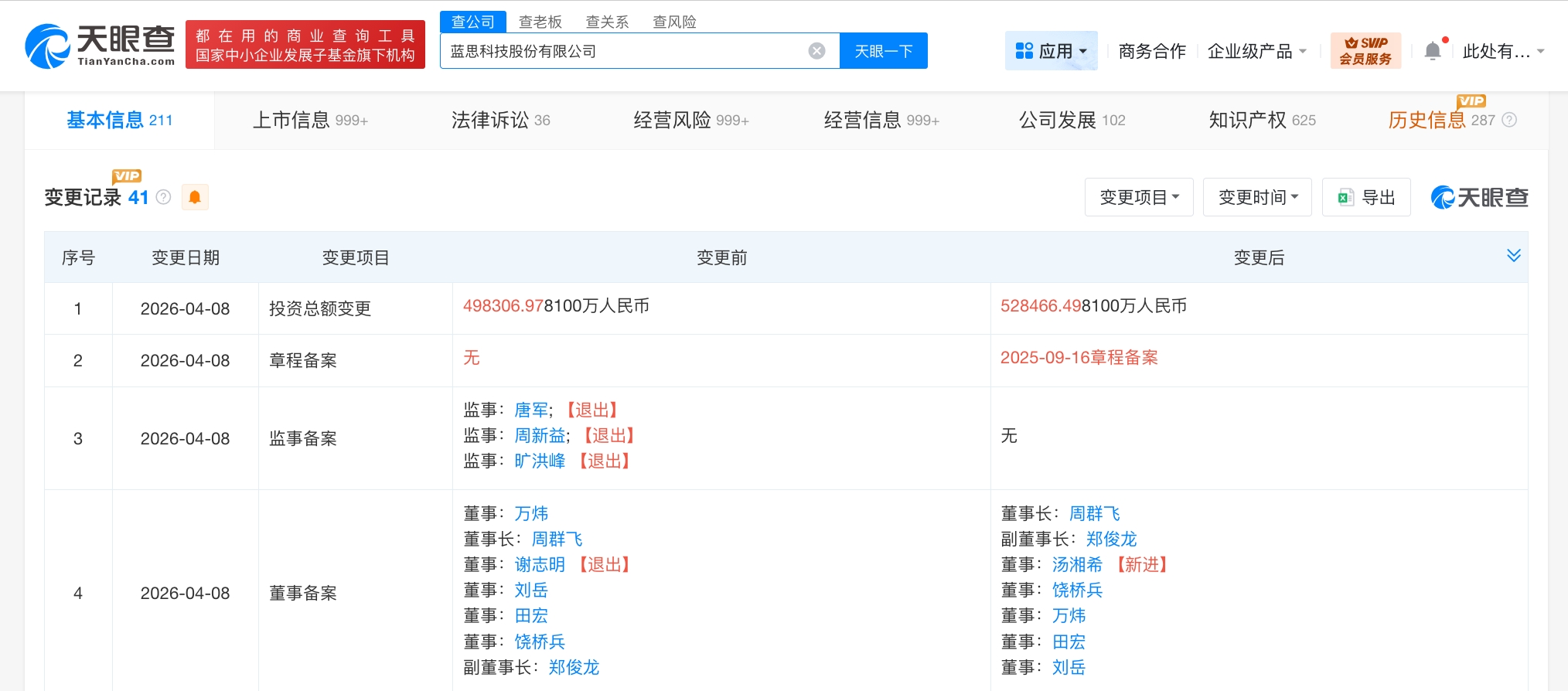 每经AI快讯,天眼查工商信息显示,近日,蓝思科技股份有限公司发生工商变更,注册资本由约49.8亿元人民币增至约52.8亿元人民币,增幅约6%。该公司成立于2006年12月,法定代表人为周群飞,经营范围包括光学玻璃制造、电子元器件制造、智能车载设备制造等。股东信息显示,该公司由蓝思科技(香港)有限公司、长沙群欣投资咨询有限公司等共同持股。
