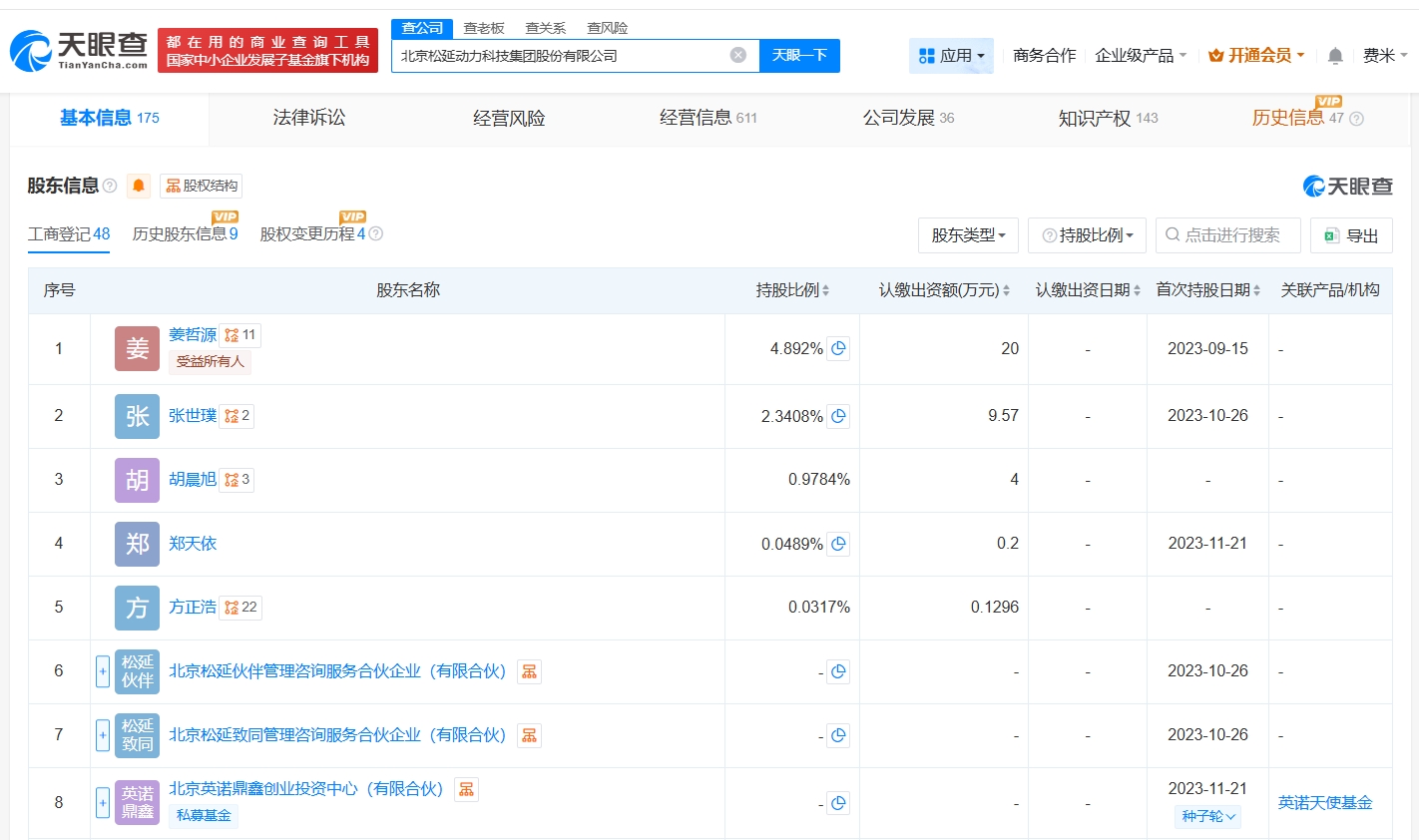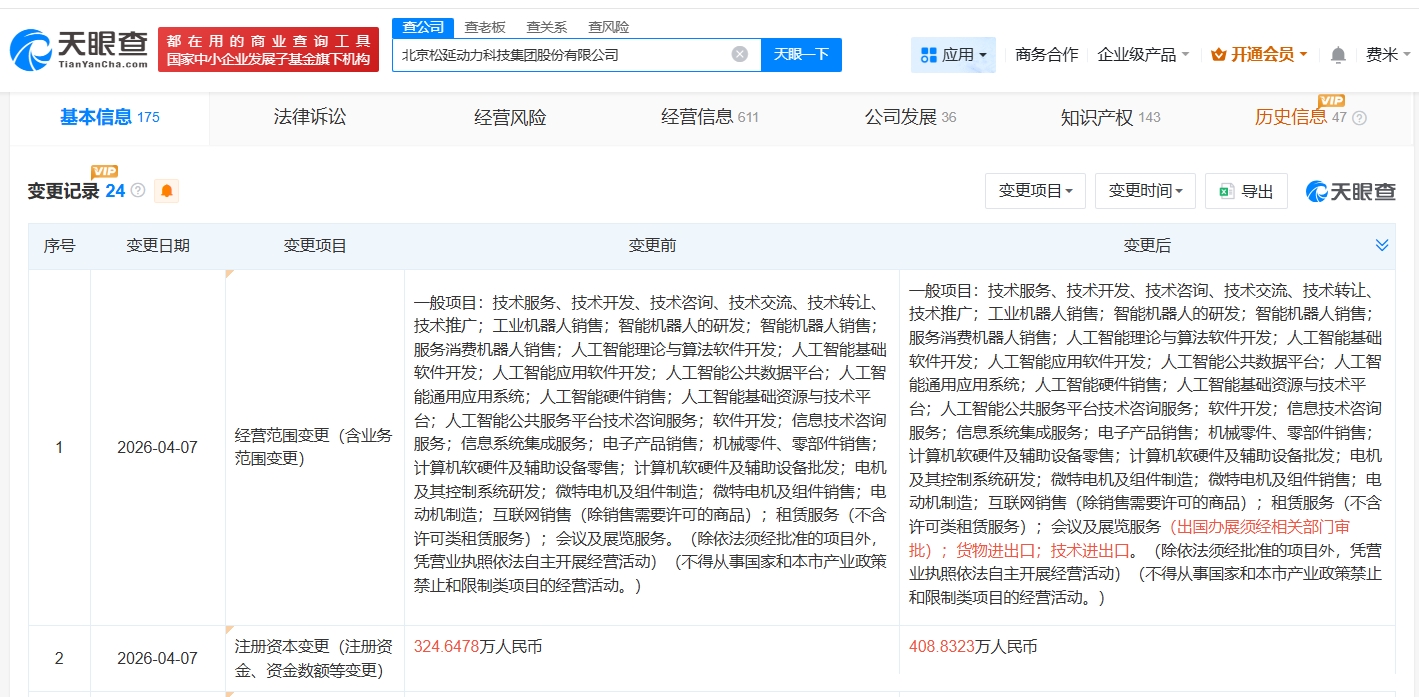 每经AI快讯,天眼查工商信息显示,近日,北京松延动力科技集团股份有限公司发生工商变更,注册资本由约324.6万元人民币增至约409万元人民币,增幅约26%。该公司成立于2023年9月,法定代表人为姜哲源,经营范围包括工业机器人销售、智能机器人的研发、智能机器人销售等。股东信息显示,该公司由姜哲源、张世璞、北京机器人产业发展投资基金(有限合伙)等共同持股。变更记录显示,去年2月以来,该公司已多次增资。