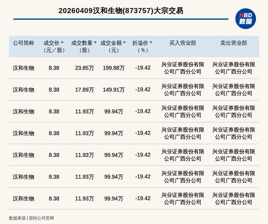 每经讯,2026年4月9日,新三板创新层公司汉和生物(873757,收盘价:10.4元)发生7笔大宗交易,总成交金额为849.48万元,成交金额最高的一笔成交价8.38元/股,成交数量23.85万股,成交金额199.88万元,折价19.42%。买入营业部是兴业证券股份有限公司广西分公司,卖出营业部是兴业证券股份有限公司广西分公司。