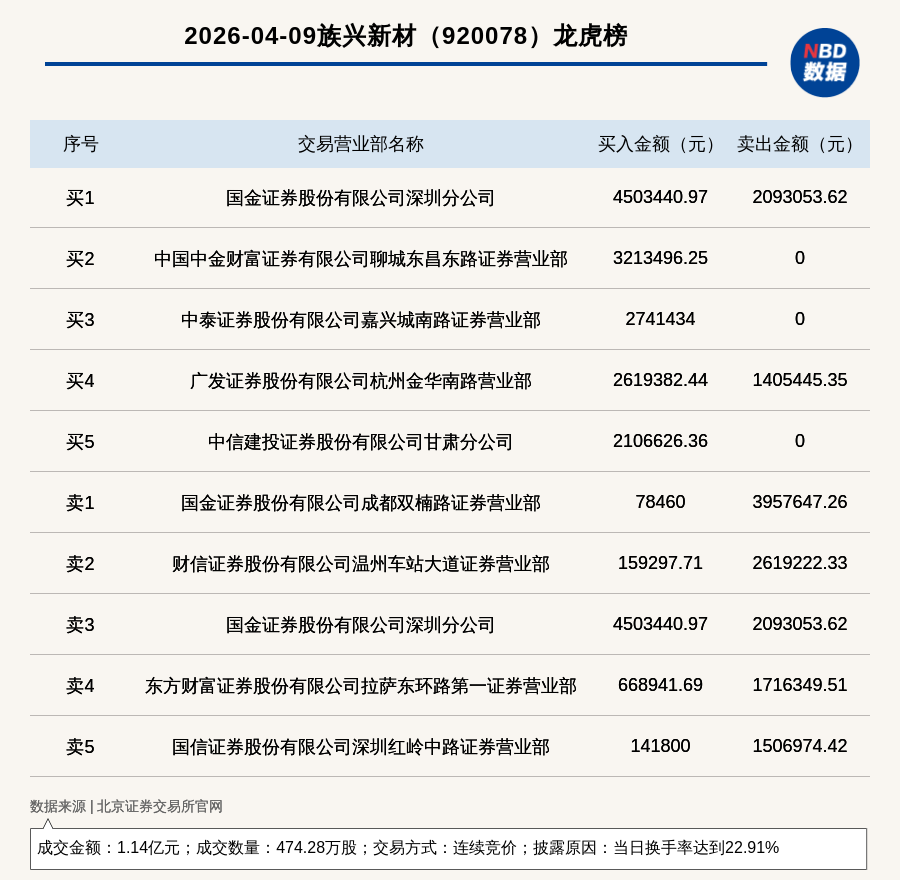 每经讯,2026年4月9日,北交所上市公司族兴新材(920078,收盘价:23.61元)登上龙虎榜,交易方式是连续竞价,披露原因是当日换手率达到22.91%,成交数量474.28万股,成交金额1.14亿元。买一席位为国金证券股份有限公司深圳分公司,买入450.34万元;卖一席位为国金证券股份有限公司成都双楠路证券营业部,卖出395.76万元。