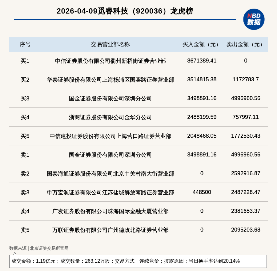 每经讯,2026年4月9日,北交所上市公司觅睿科技(920036,收盘价:44.89元)登上龙虎榜,交易方式是连续竞价,披露原因是当日换手率达到20.14%,成交数量263.12万股,成交金额1.19亿元。买一席位为中信证券股份有限公司衢州新桥街证券营业部,买入867.14万元;卖一席位为国金证券股份有限公司深圳分公司,卖出499.7万元。