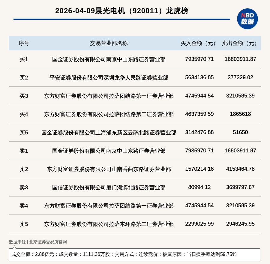 每经讯,2026年4月9日,北交所上市公司晨光电机(920011,收盘价:25.21元)登上龙虎榜,交易方式是连续竞价,披露原因是当日换手率达到59.75%,成交数量1111.36万股,成交金额2.88亿元。买一席位为国金证券股份有限公司南京中山东路证券营业部,买入793.6万元;卖一席位为国金证券股份有限公司南京中山东路证券营业部,卖出1680.39万元。