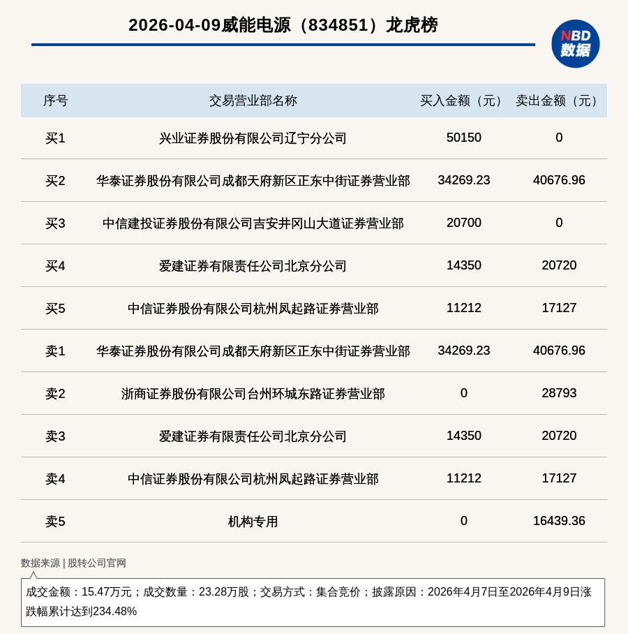 每经讯,2026年4月9日,新三板基础层公司威能电源(834851,收盘价:0.97元)登上龙虎榜,交易方式是集合竞价,披露原因是2026年4月7日至2026年4月9日涨跌幅累计达到234.48%,成交数量23.28万股,成交金额15.47万元。买一席位为兴业证券股份有限公司辽宁分公司,买入5.02万元;卖一席位为华泰证券股份有限公司成都天府新区正东中街证券营业部,卖出4.07万元。