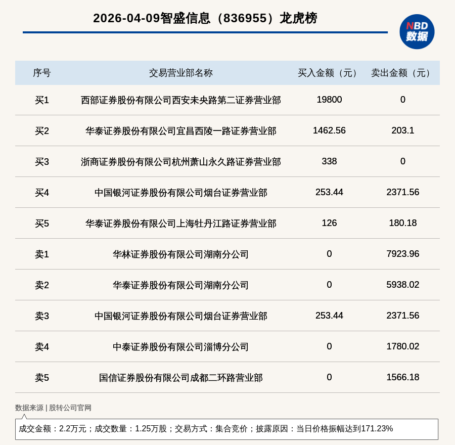 每经讯,2026年4月9日,新三板创新层公司智盛信息(836955,收盘价:1.68元)登上龙虎榜,交易方式是集合竞价,披露原因是当日价格振幅达到171.23%,成交数量1.25万股,成交金额2.2万元。买一席位为西部证券股份有限公司西安未央路第二证券营业部,买入1.98万元;卖一席位为华林证券股份有限公司湖南分公司,卖出7923.96元。