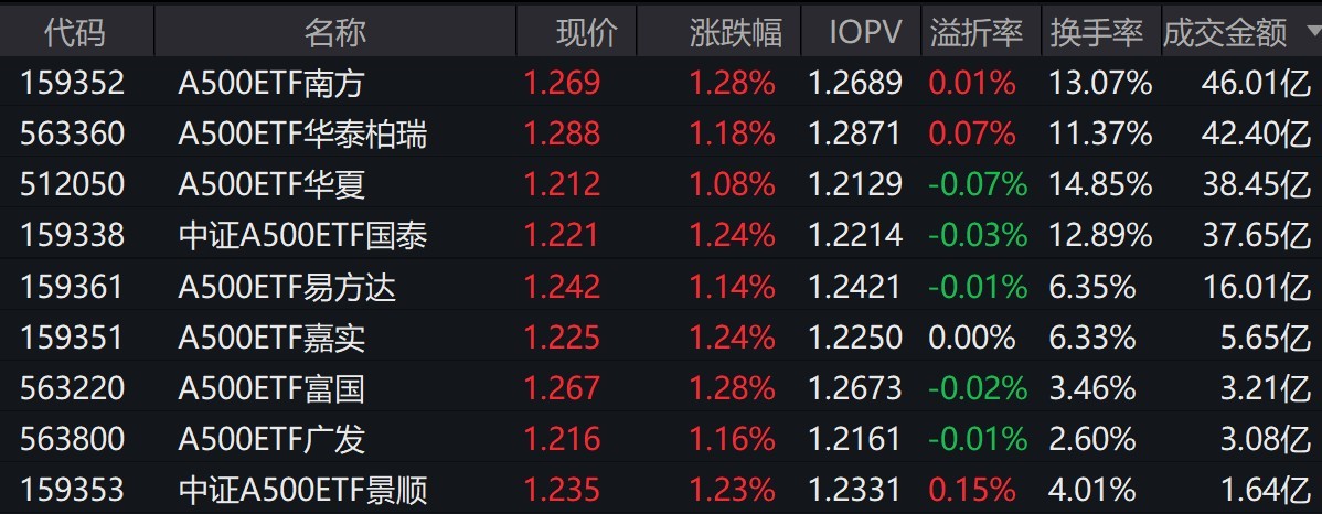 截至上午收盘,场内跟踪中证A500指数的ETF涨超1%。其中,有9只中证A500相关ETF成交额超1亿元,2只超42亿元。A500ETF南方、A500ETF华泰柏瑞早盘成交额分别为46.01亿元、42.4亿元。