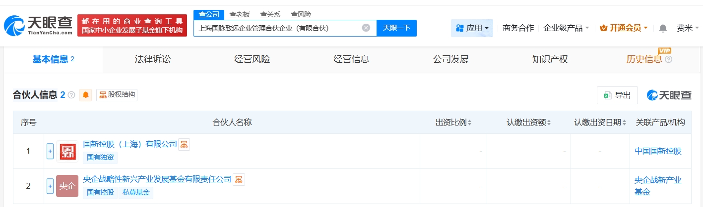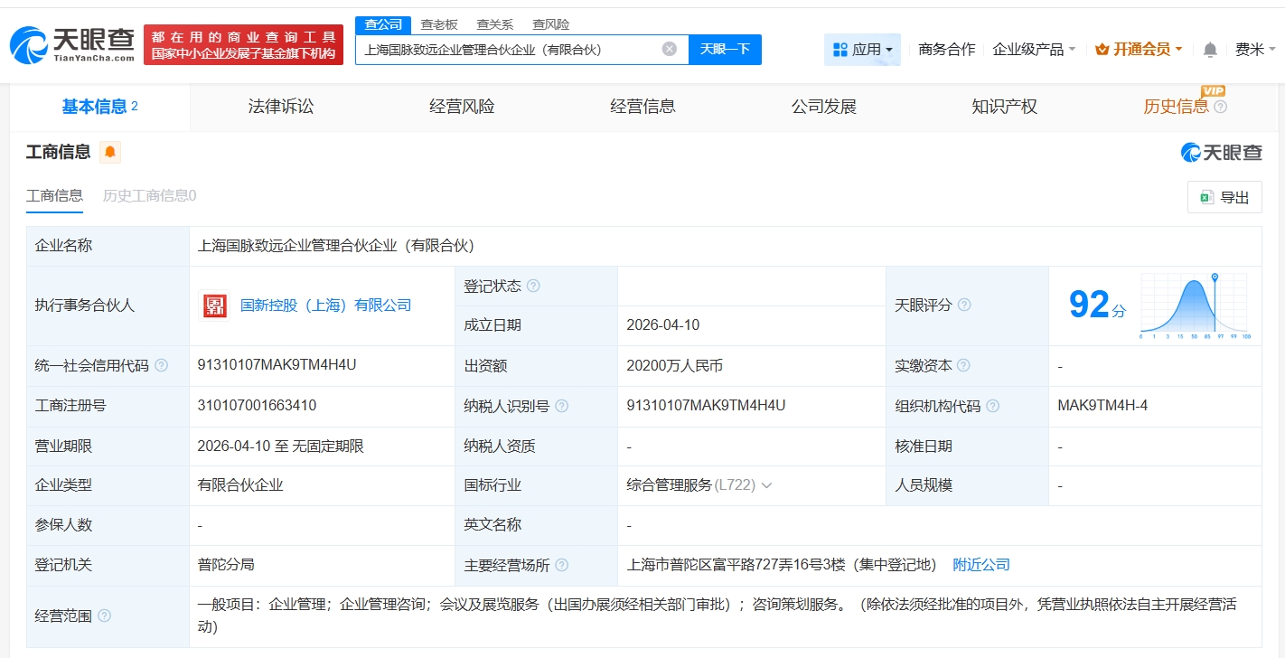 每经AI快讯,天眼查App显示,4月10日,上海国脉致远企业管理合伙企业(有限合伙)成立,执行事务合伙人为国新控股(上海)有限公司,出资额2.02亿元人民币,经营范围包括企业管理、企业管理咨询、会议及展览服务等。合伙人信息显示,该合伙企业由国新控股(上海)有限公司、央企战略性新兴产业发展基金有限责任公司共同出资。