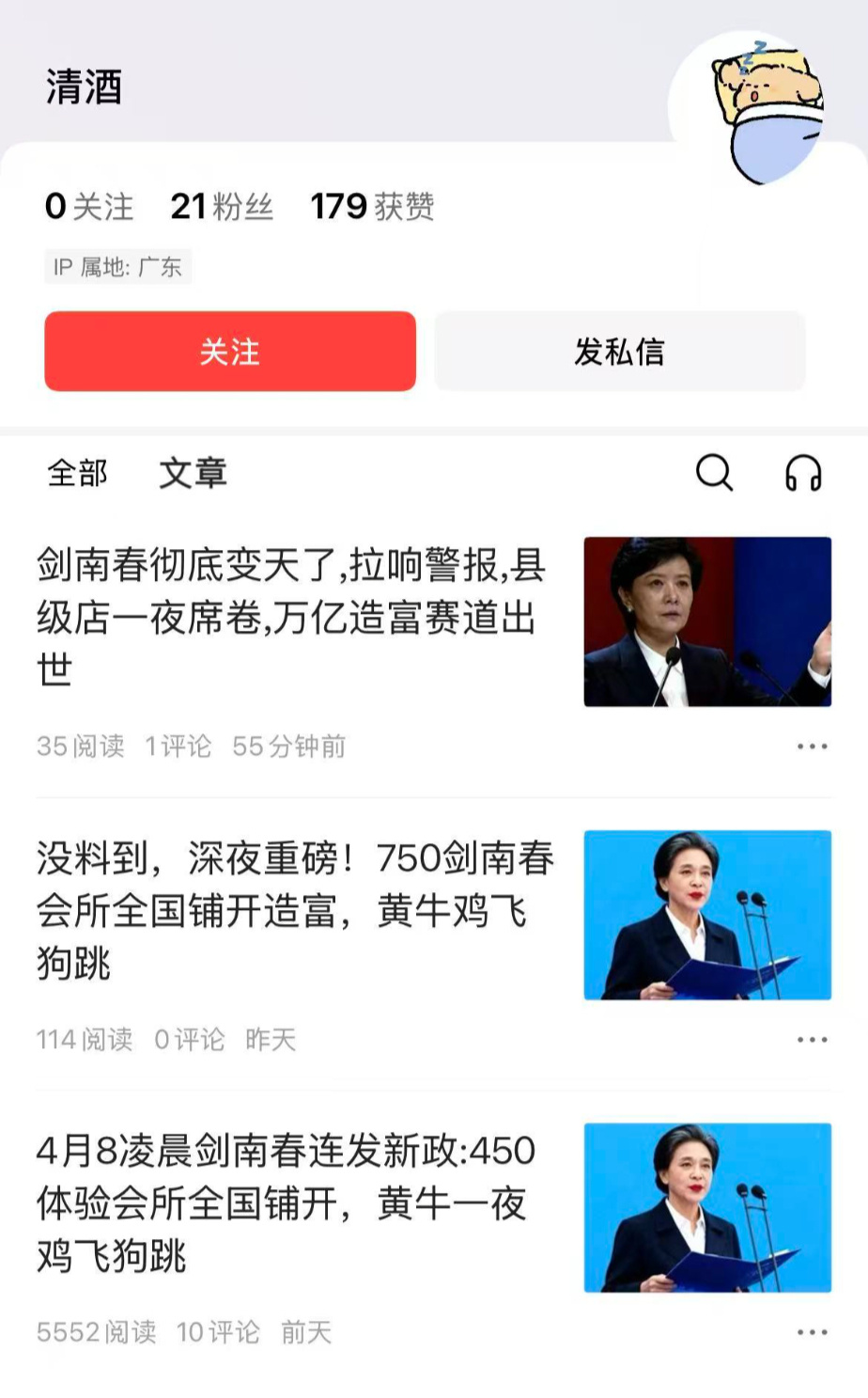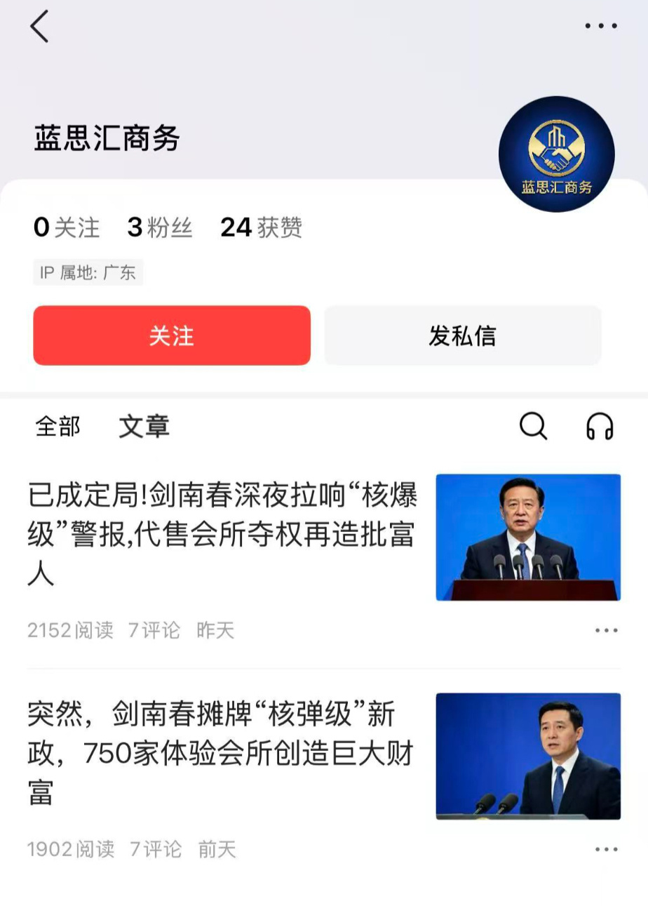 得到剑南春否定回应后,记者随后仔细调查了上述文章的来源以及散布渠道发现,散布虚假招商的账号,过往发布内容基本只有所谓的“剑南春招商信息”,几乎从未发布过其他内容,或是有预谋地通过僵尸号来增加发布频率,提升招商热度。