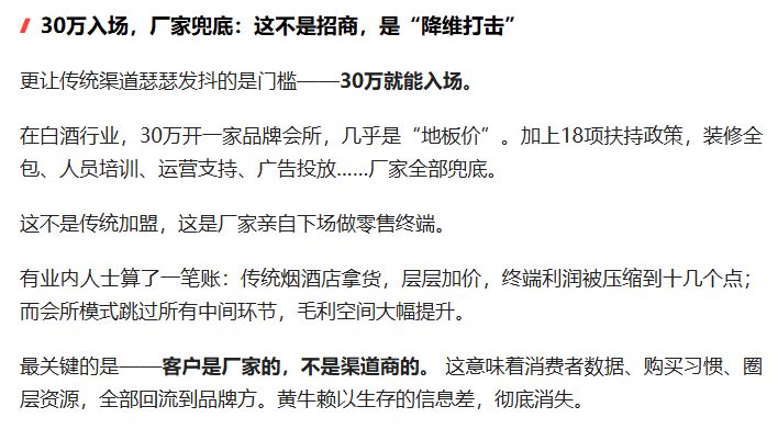 《每日经济新闻·将进酒》记者注意到,上述在市场流传的文章写道:“30万入场,厂家兜底:这不是招商,是‘降维打击’。有业内人士算了一笔账:传统烟酒店拿货,层层加价,终端利润被压缩到十几个点;而会所模式跳过所有中间环节,毛利空间大幅提升。最关键的是——客户是厂家的,不是渠道商的。 这意味着消费者数据、购买习惯、圈层资源,全部回流到品牌方。黄牛赖以生存的信息差,彻底消失。”