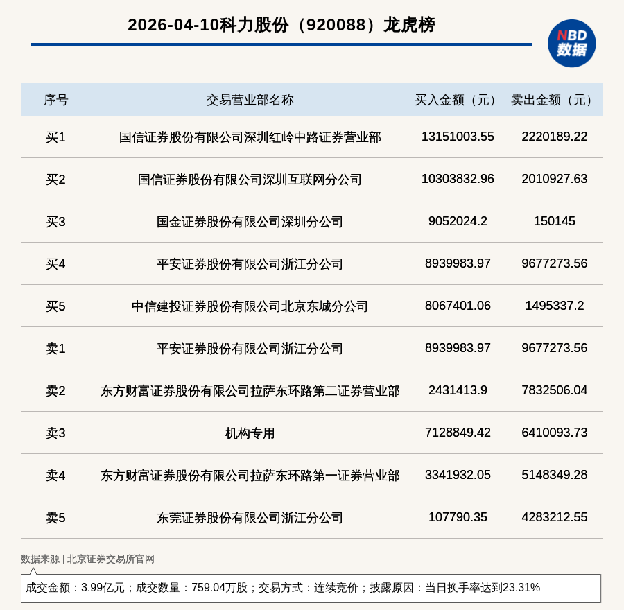 每经讯,2026年4月10日,北交所上市公司科力股份(920088,收盘价:53.5元)登上龙虎榜,交易方式是连续竞价,披露原因是当日换手率达到23.31%,成交数量759.04万股,成交金额3.99亿元。买一席位为国信证券股份有限公司深圳红岭中路证券营业部,买入1315.1万元;卖一席位为平安证券股份有限公司浙江分公司,卖出967.73万元。