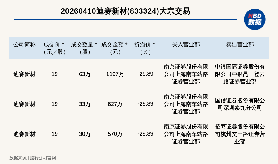 每经讯,2026年4月10日,新三板基础层公司迪赛新材(833324,收盘价:27.1元)发生3笔大宗交易,总成交金额为2394万元,成交金额最高的一笔成交价19元/股,成交数量63万股,成交金额1197万元,折价29.89%。买入营业部是南京证券股份有限公司上海南车站路证券营业部,卖出营业部是中银国际证券股份有限公司中银昆山登云路证券营业部。