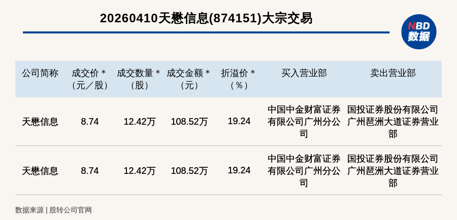 每经讯,2026年4月10日,新三板创新层公司天懋信息(874151,收盘价:7.33元)发生2笔大宗交易,总成交金额为217.05万元,成交金额最高的一笔成交价8.74元/股,成交数量12.42万股,成交金额108.52万元,溢价19.24%。买入营业部是中国中金财富证券有限公司广州分公司,卖出营业部是国投证券股份有限公司广州琶洲大道证券营业部。
