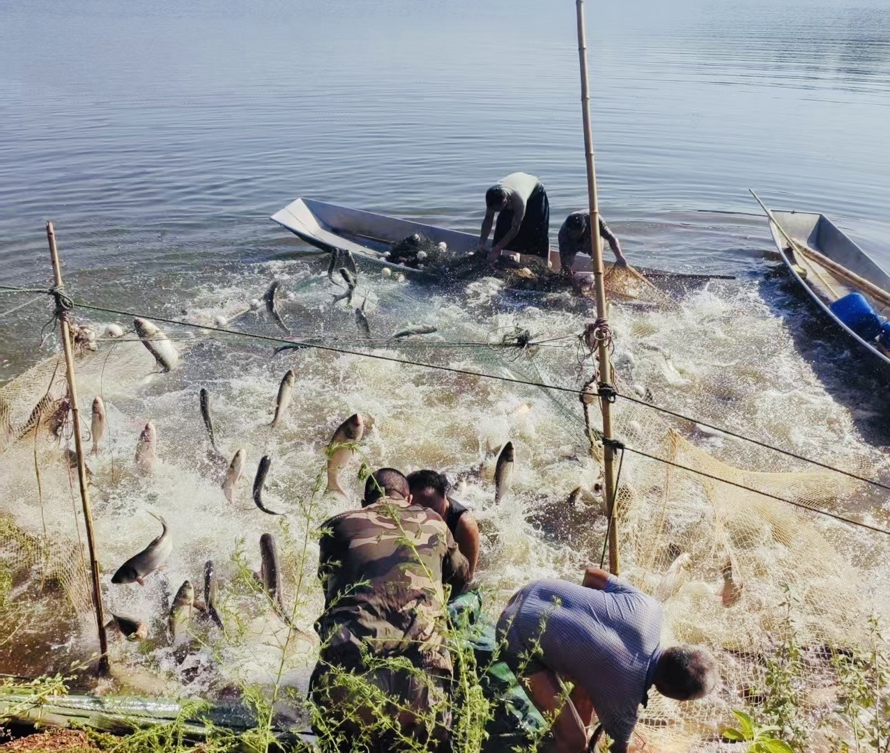 鲤鱼水库捕鱼场景。