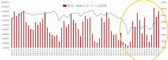 当然,如果你觉得涨停板只代表游资的情绪,那么看“收盘价在5日线上的公司占比”,也能反应市场的短期情绪。