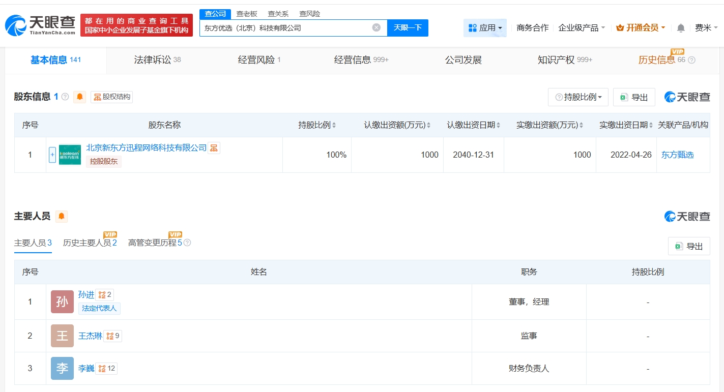 每经AI快讯,天眼查App显示,近日,东方优选(北京)科技有限公司发生工商变更,孙东旭卸任法定代表人、执行董事、经理,孙进接任法定代表人、经理并担任董事。该公司成立于2021年10月,注册资本1000万元人民币,经营范围含鲜肉批发、鲜肉零售、水产品批发等,由北京新东方迅程网络科技股份有限公司全资持股。