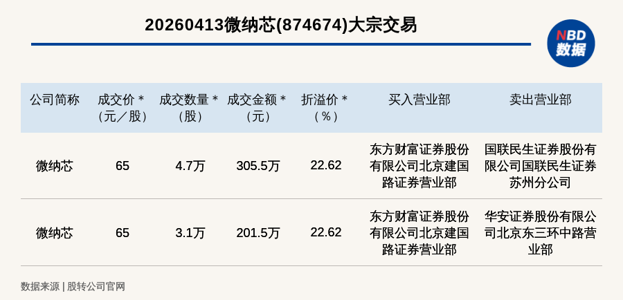 每经讯,2026年4月13日,新三板创新层公司微纳芯(874674,收盘价:53.01元)发生2笔大宗交易,总成交金额为507万元,成交金额最高的一笔成交价65元/股,成交数量4.7万股,成交金额305.5万元,溢价22.62%。买入营业部是东方财富证券股份有限公司北京建国路证券营业部,卖出营业部是国联民生证券股份有限公司国联民生证券苏州分公司。