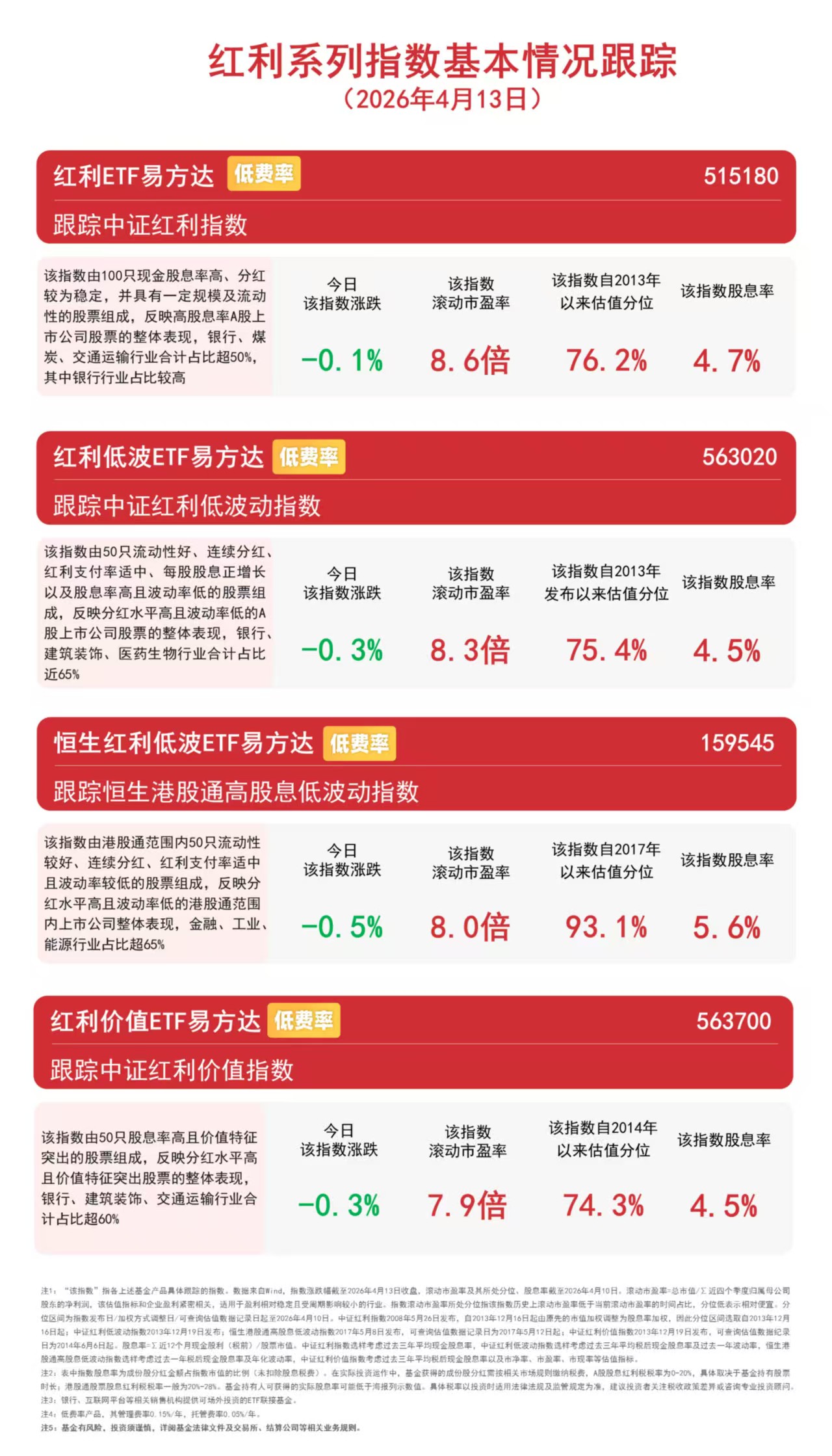 截至收盘,中证红利指数下跌0.1%,中证红利低波动指数下跌0.3%,中证红利价值指数下跌0.3%,恒生港股通高股息低波动指数下跌0.5%。资金近期持续加码相关产品,红利ETF易方达(515180,联接基金A/C/Y:009051/009052/022925)和红利低波ETF易方达(563020,联接基金A/C:020602/020603)上周分别获2.1亿元和4.2亿元资金净流入。