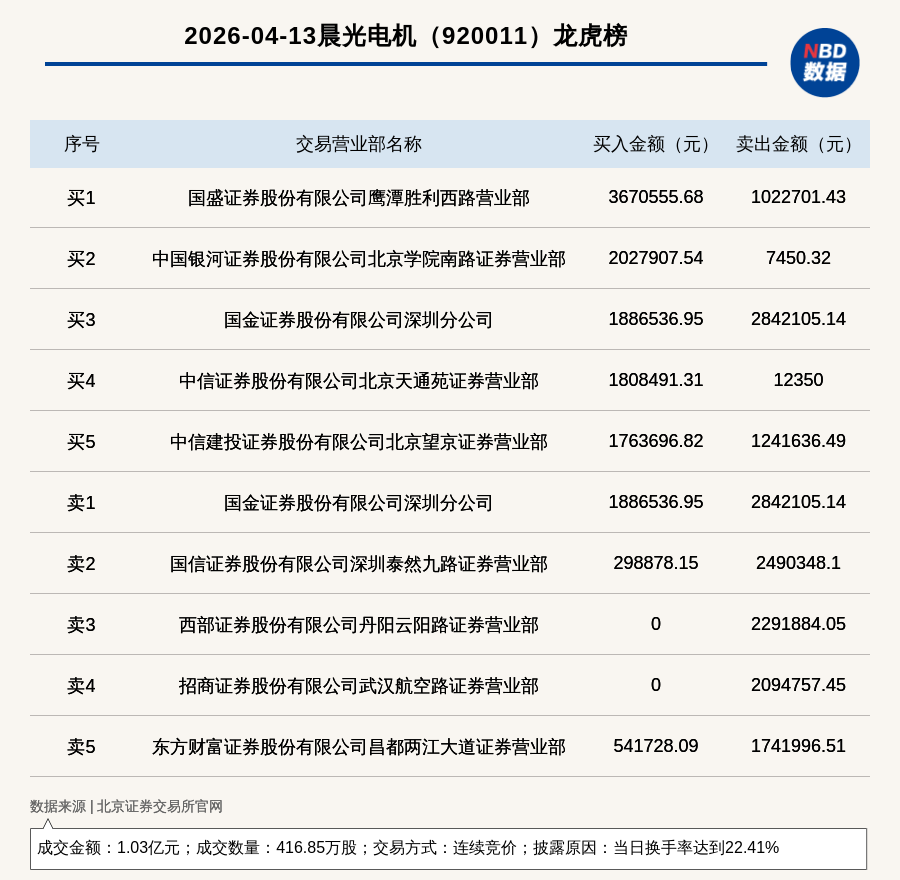 每经讯,2026年4月13日,北交所上市公司晨光电机(920011,收盘价:24.82元)登上龙虎榜,交易方式是连续竞价,披露原因是当日换手率达到22.41%,成交数量416.85万股,成交金额1.03亿元。买一席位为国盛证券股份有限公司鹰潭胜利西路营业部,买入367.06万元;卖一席位为国金证券股份有限公司深圳分公司,卖出284.21万元。