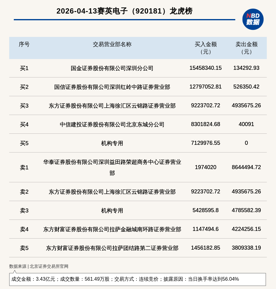 每经讯,2026年4月13日,北交所上市公司赛英电子(920181,收盘价:60.95元)登上龙虎榜,交易方式是连续竞价,披露原因是当日换手率达到56.04%,成交数量561.49万股,成交金额3.43亿元。买一席位为国金证券股份有限公司深圳分公司,买入1545.83万元;卖一席位为华泰证券股份有限公司深圳益田路荣超商务中心证券营业部,卖出864.45万元。