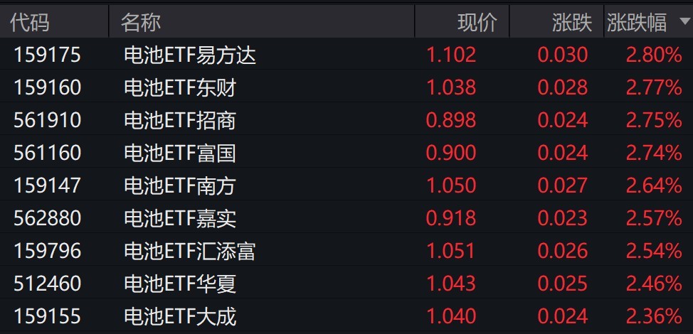 电池概念股走强,天赐材料涨超5%,阳光电源、亿纬锂能、欣旺达涨超3%。