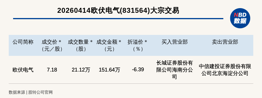 每经讯,2026年4月14日,新三板创新层公司欧伏电气(831564,收盘价:7.67元)发生一笔大宗交易,成交价7.18元/股,成交数量21.12万股,成交金额151.64万元,折价6.39%。买入营业部是长城证券股份有限公司海南分公司,卖出营业部是中信建投证券股份有限公司北京海淀分公司。