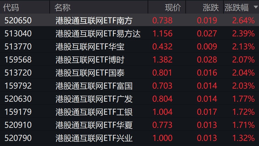 受盘面影响,多只港股通互联网相关ETF涨超2%。