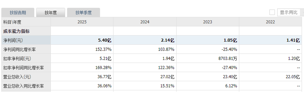 盈利能力质变突破,盈利指标屡创新高。归母净利润从2023年的1.05亿元飙升至2025年的5.40亿元,2024年同比增长103.87%,2025年增速高达152.37%,两年实现利润超5倍增长。毛利率同步大幅改善,从2023年的13.98%提升至2025年的26.36%,三年几乎翻倍,盈利效率显著赶超行业平均水平。