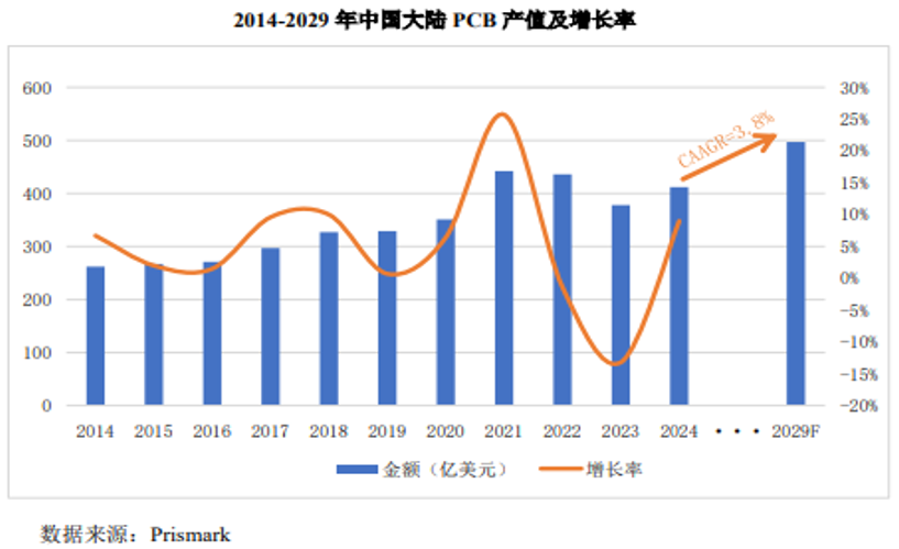 行业需求持续爆发,高端PCB国产替代加速。全球PCB市场规模稳步扩容,根据 Prismark数据,2024年全球PCB市场产值达735.65亿美元,预计将以5.20%的年复合增长率稳步提升,到2029年达到946.61亿美元。而作为全球 PCB 制造中心,中国大陆的PCB市场产值预计将在2029年达至497.04亿美元,为公司业务发展提供广阔空间。