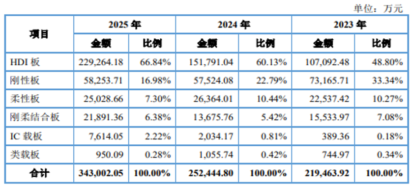 营收规模稳步扩容,增长势能持续释放。2023年至2025年,红板科技营业收入分别达23.40亿元、27.02亿元、36.77亿元,2024年同比增长15.51%,2025年增速跃升至36.06%,三年复合增长率超18%。营收结构持续优化,作为核心业务的HDI板收入占比常年超59%,2025年贡献收入超21亿元,成为业绩增长的核心引擎。