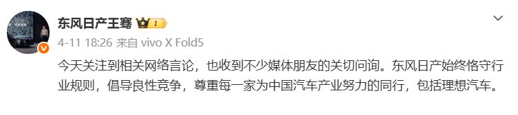 对此,东风日产新能源品牌总经理王骞于4月11日晚间通过官方认证微博作出回应,称“东风日产始终恪守行业规则、倡导良性竞争,尊重每一家为中国汽车产业努力的同行,包括理想汽车”。